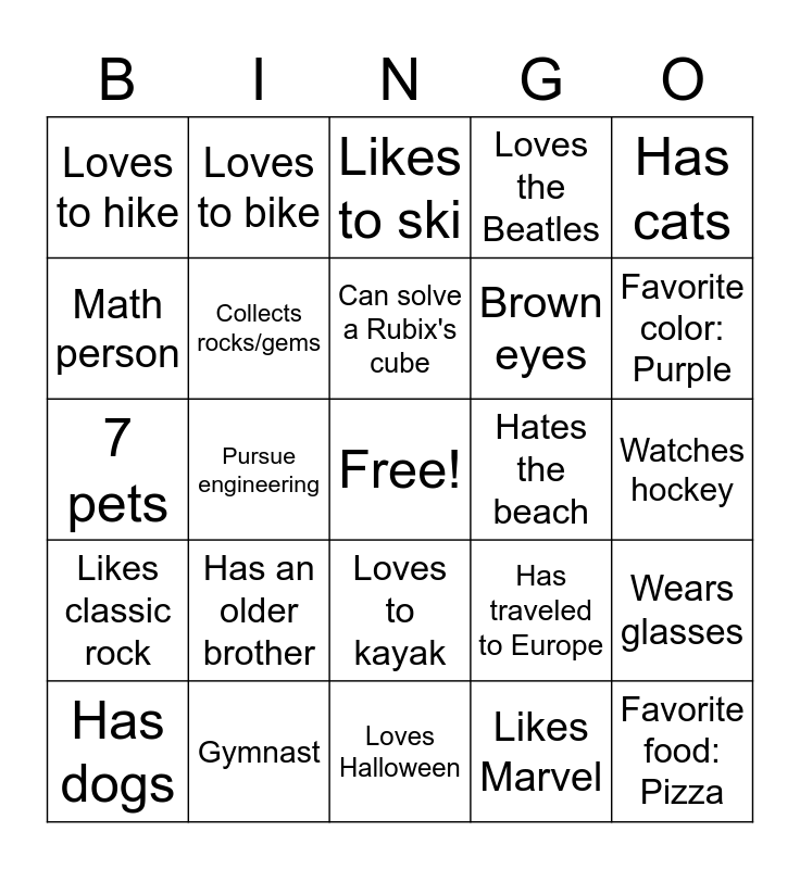 This bingo card has a free space and 24 words: Has an older brother, Gymnast, Can solve a Rubix's cube, Has dogs, Has cats, Loves to hike, Math person, Loves to bike, Hates the beach, Loves to kayak, Brown eyes, 7 pets, Has traveled to Europe, Wears glasses, Collects rocks/gems, Likes Marvel, Watches hockey, Likes to ski, Favorite color: Purple, Pursue engineering, Favorite food: Pizza, Likes classic rock, Loves the Beatles and Loves Halloween.