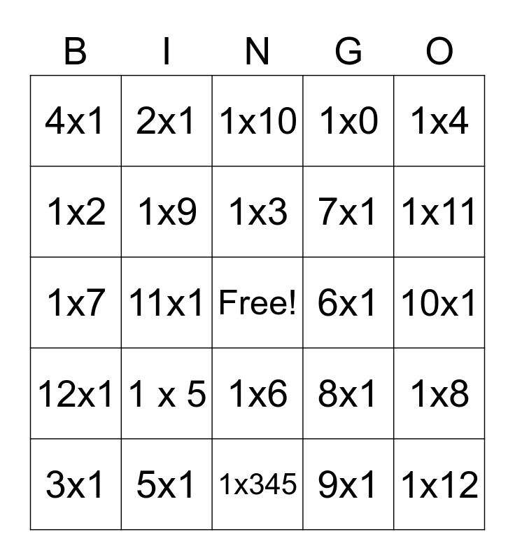 This bingo card has a free space and 24 words: 1 x 5, 5x1, 1x3, 3x1, 1x4, 4x1, 1x2, 2x1, 6x1, 1x6, 7x1, 1x7, 8x1, 1x8, 1x9, 9x1, 10x1, 1x10, 1x11, 11x1, 1x12, 12x1, 1x0 and 1x345.