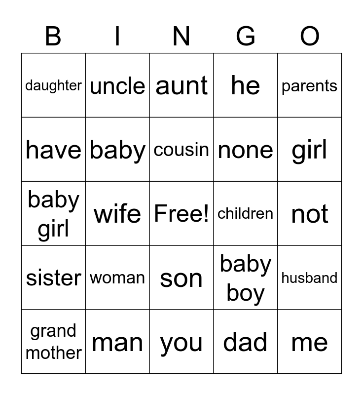This bingo card has a free space and 34 words: mom, dad, family, brother, sister, baby, parents, grand mother, uncle, grand father, cousin, aunt, child, boy, children, girl, man, baby girl, woman, baby boy, son, no, daughter, not, you, me, he, they, none, have, married, wife, husband and none.