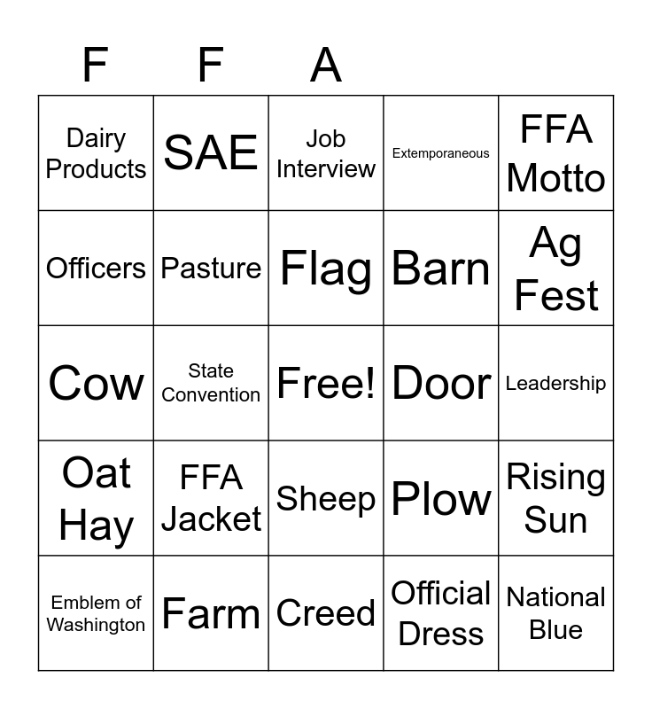 This bingo card has a free space and 53 words: FFA, National Blue, Corn Gold, Official Dress, FFA Jacket, Ag Mechanics, SAE, AET, Officers, Teamwork, Pasture, Alfalfa Hay, Rising Sun, Plow, Ear of Corn, Emblem of Washington, Flag, Door, Owl, FFA Motto, State Convention, National Convention, Barn, Dairy Products, Meetings, Farm, Greenhand Degree, Chapter Degree, State Degree, Ag Fest, Agriculture, Floral Culture, Tractor, Bucket, Fwiendship, Public Speaking, Extemporaneous, Creed, Job Interview, Impromptu, Opportunity, Ranch, Leadership, Goat, Horse, Sheep, Pig, Chicken, Cow, Oat Hay, Grain, I believe and Future.