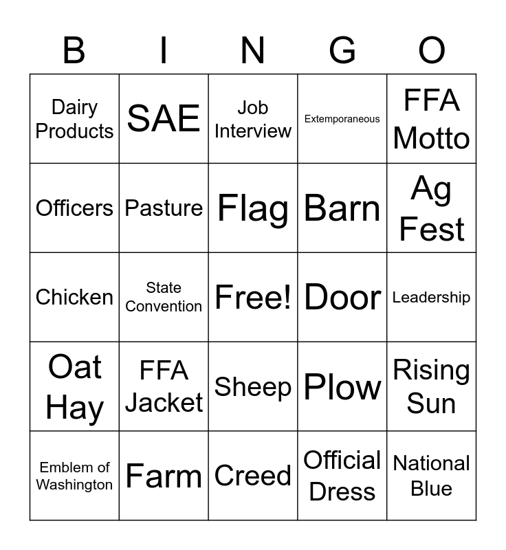 This bingo card has a free space and 53 words: FFA, National Blue, Corn Gold, Official Dress, FFA Jacket, Ag Mechanics, SAE, AET, Officers, Teamwork, Pasture, Alfalfa Hay, Rising Sun, Plow, Ear of Corn, Emblem of Washington, Flag, Door, Owl, FFA Motto, State Convention, National Convention, Barn, Dairy Products, Meetings, Farm, Greenhand Degree, Chapter Degree, State Degree, Ag Fest, Agriculture, Floral Culture, Tractor, Bucket, Fwiendship, Public Speaking, Extemporaneous, Creed, Job Interview, Impromptu, Opportunity, Ranch, Leadership, Goat, Horse, Sheep, Pig, Cow, Chicken, Oat Hay, Grain, I believe and Future.