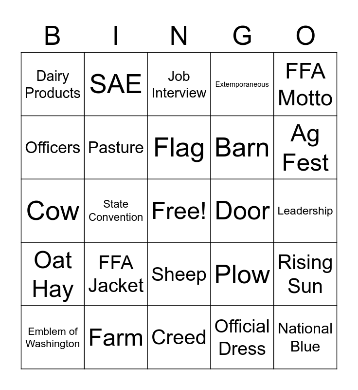 This bingo card has a free space and 53 words: FFA, National Blue, Corn Gold, Official Dress, FFA Jacket, Ag Mechanics, SAE, AET, Officers, Teamwork, Pasture, Alfalfa Hay, Rising Sun, Plow, Ear of Corn, Emblem of Washington, Flag, Door, Owl, FFA Motto, State Convention, National Convention, Barn, Dairy Products, Meetings, Farm, Greenhand Degree, Chapter Degree, State Degree, Ag Fest, Agriculture, Floral Culture, Tractor, Bucket, Fwiendship, Public Speaking, Extemporaneous, Creed, Job Interview, Impromptu, Opportunity, Ranch, Leadership, Goat, Horse, Sheep, Pig, Chicken, Cow, Oat Hay, Grain, Future and I believe.