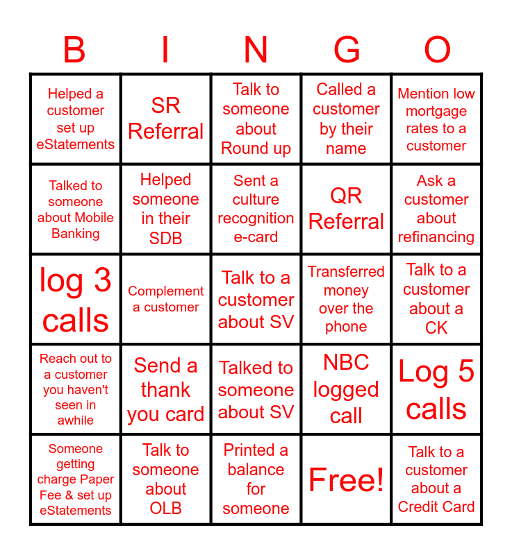 This bingo card has 30 words: Talk to someone about OLB, Printed a statement for someone, Complement a customer, Talked to someone about eStatements, Helped a customer set up eStatements, Talk to someone about Round up, Helped someone in their SDB, Talked to someone about SV, Transferred money over the phone, Printed a balance for someone, Talk to a customer about a CK, Talk to a customer about SV, Free!, Talk to a customer about a Credit Card, Ask a customer about refinancing, Find a customer with fees & called them, NBC logged call, Reach out to a customer you haven't seen in awhile, Send a thank you card, Mention low mortgage rates to a customer, log 3 calls, HV Call, SR Referral, QR Referral, Talked to someone about Mobile Banking, Called a customer by their name, Log 5 calls, Someone getting charge Paper Fee & set up eStatements, Sent a culture recognition e-card and talk to a non customer about our CK accounts.