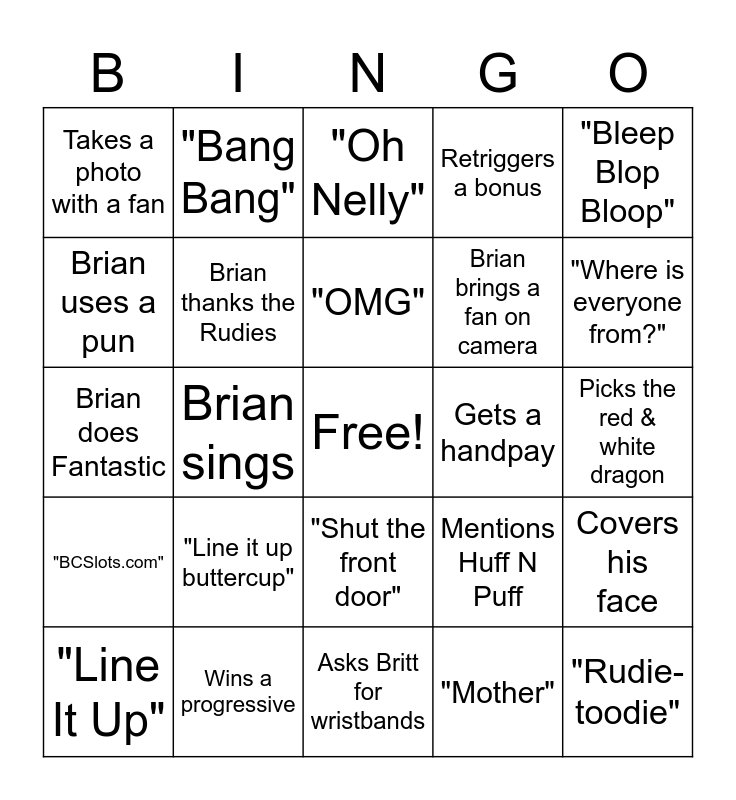 This bingo card has a free space and 45 words: "Rude", "Rudie-toodie", "Banza", "Line It Up", "3 Backup Spins", "Mother", "Oh Nelly", "Jackpot", "Bleep Blop Bloop", Wins a progressive, Retriggers a bonus, Gets a handpay, "Shut the front door", "Line it up buttercup", Forgets an item, Asks Britt for wristbands, Windexes the screen, Brian does Fantastic, "Holy shoot", "Where is everyone from?", "Bang Bang", "Sexy multipliers", Brian snorts, Takes a photo with a fan, Asks the audience to pick a number, Picks the red & white dragon, Edgar roars, A spin on Wheel of Fortune, Mentions Huff N Puff, "BCSlots.com", "Don't forget to subscribe", Covers his face, "Beautiful", Brian rapid fires, Brian whistles, Brian sings, A pot closes, Bonus in the bonus, Hold and spin bonus, "OMG", Brian uses a pun, Brian brings a fan on camera, Superchat over $20, Brian thanks the Rudies and "Rudies4Life.com".