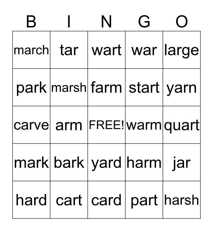 This bingo card has a free space and 24 words: bark, cart, farm, hard, large, march, park, tar, warm, yard, start, carve, harm, jar, marsh, part, quart, wart, yarn, arm, harsh, mark, war and card.