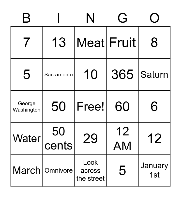 This bingo card has a free space and 50 words: December 31st, January 1st, Joe Biden, Look across the street, 50 cents, 24, 13, 7, 5, Independence of America, Sacramento, Fruit, 12, 12 AM, 12 PM, 4, 10, 60, 12, 8, 50, 5, 7, 365, Helium, 14 days, Saturn, The Milky Way, Meat, 29, Arizona, The Star Spangled Banner, The White House, Butterflies, Omnivore, Jupiter, Owls, Red, 26, 6, 4, 3, The Sun, 2021, March, George Washington, Abraham Lincoln, None, Water and Daylight savings.