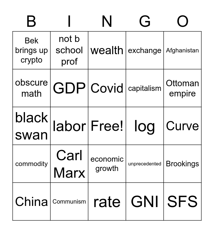 This bingo card has a free space and 24 words: Carl Marx, Communism, Covid, China, Afghanistan, Bek brings up crypto, obscure math, not b school prof, log, economic growth, capitalism, black swan, unprecedented, Brookings, GDP, GNI, Curve, wealth, Ottoman empire, labor, SFS, commodity, exchange and rate.