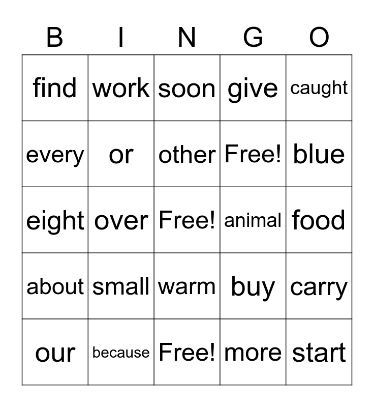 This bingo card has a free space and 27 words: buy, done, Free!, Free!, every, soon, work, about, animal, carry, eight, give, our, because, blue, into, or, other, small, find, food, more, over, start, warm, caught and flew.