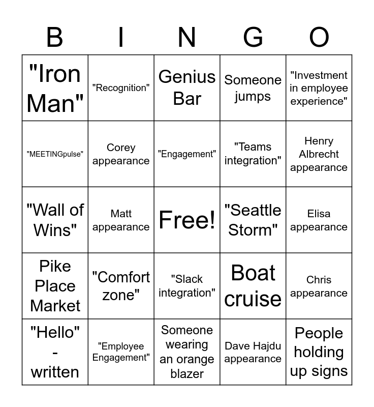 This bingo card has a free space and 24 words: "Comfort zone", "Employee Engagement", "Engagement", "Hello" - written, "Investment in employee experience", "Iron Man", "MEETINGpulse", "Recognition", "Seattle Storm", "Slack integration", "Teams integration", "Wall of Wins", Boat cruise, Chris appearance, Corey appearance, Dave Hajdu appearance, Elisa appearance, Genius Bar, Henry Albrecht appearance, Matt appearance, People holding up signs, Pike Place Market, Someone jumps and Someone wearing an orange blazer.