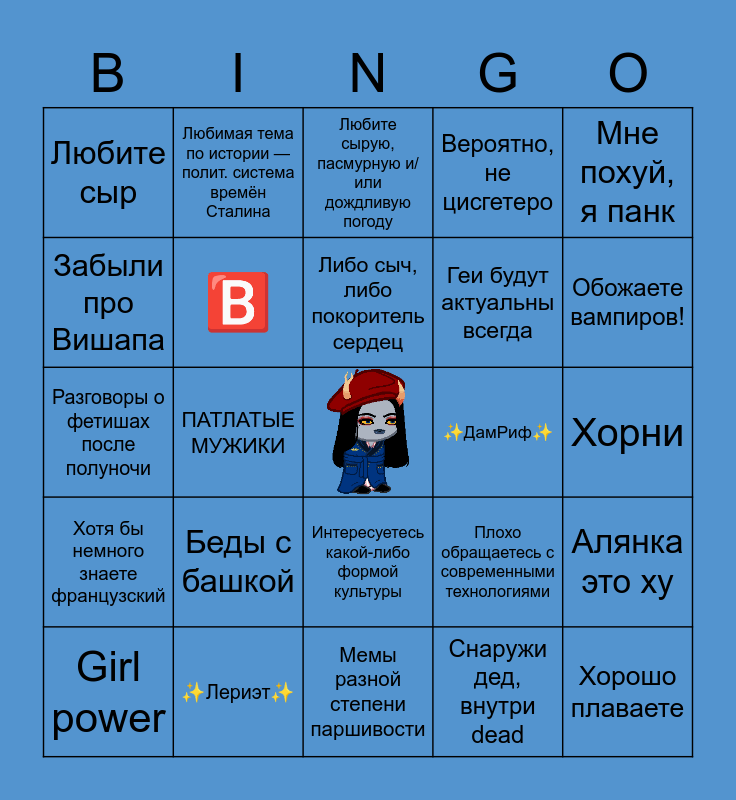 This bingo card has a free space and 24 words: Беды с башкой, ✨Лериэт✨, Либо сыч, либо покоритель сердец, Girl power, Мне похуй, я панк, Любите сыр, Забыли про Вишапа, Любимая тема по истории — полит. система времён Сталина, ✨ДамРиф✨, Интересуетесь какой-либо формой культуры, Геи будут актуальны всегда, Разговоры о фетишах после полуночи, Плохо обращаетесь с современными технологиями, Алянка это ху, 🅱️, Снаружи дед, внутри dead, Хорни, Любите сырую, пасмурную и/или дождливую погоду, Обожаете вампиров!, ПАТЛАТЫЕ МУЖИКИ, Хорошо плаваете, Хотя бы немного знаете французский, Вероятно, не цисгетеро and Мемы разной степени паршивости.
