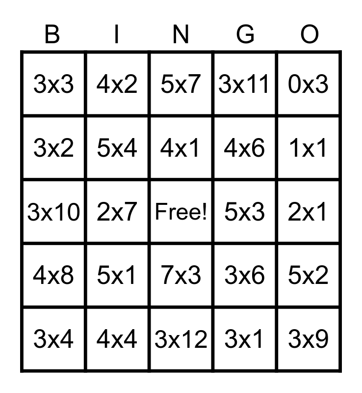 This bingo card has a free space and 24 words: 5x1, 4x4, 4x1, 3x4, 0x3, 3x3, 3x2, 4x2, 5x3, 7x3, 4x6, 3x10, 3x6, 5x2, 5x4, 3x1, 2x1, 5x7, 1x1, 2x7, 3x9, 4x8, 3x11 and 3x12.