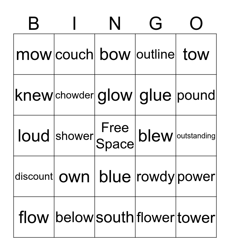 This bingo card has a free space and 24 words: own, below, glow, flow, tow, mow, knew, couch, blew, blue, glue, loud, rowdy, power, chowder, flower, outstanding, bow, pound, shower, tower, discount, outline and south.
