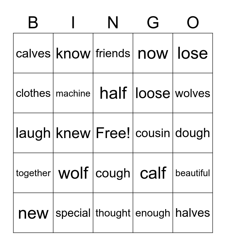 This bingo card has a free space and 24 words: wolf, special, half, new, lose, calves, clothes, know, cousin, cough, loose, laugh, calf, beautiful, machine, enough, dough, friends, wolves, knew, halves, together, now and thought.