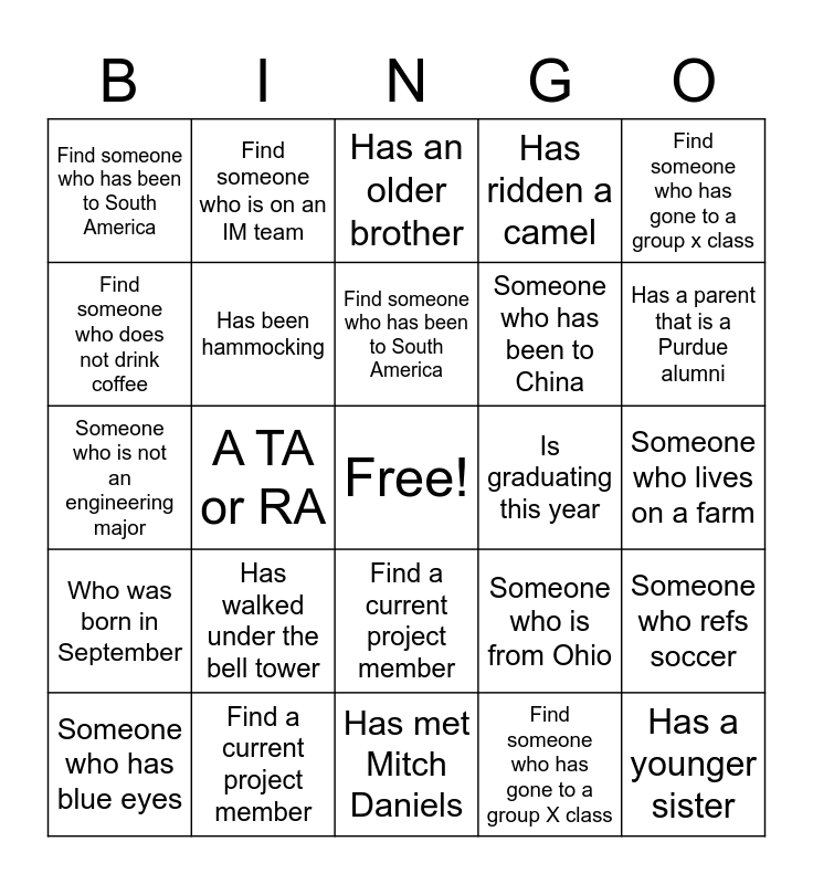 This bingo card has a free space and 26 words: Find a current project member, Find someone who has gone to a group X class, Find someone who has been to South America, Find a current project member, Find someone who has gone to a group x class, Find someone who has been to South America, Find someone who does not drink coffee, Find someone who is on an IM team, Someone who lives on a farm, Someone who is from Ohio, Someone who has been to China, Someone who is not an engineering major, Someone who refs soccer, Someone who has blue eyes, A TA or RA, Has done a fountain run, Has ridden a camel, Who was born in September, Has an older brother, Has a younger sister, Has a parent that is a Purdue alumni, Has met Mitch Daniels, Is graduating this year, Has walked under the bell tower, Has been hammocking and Speaks more than two languages.