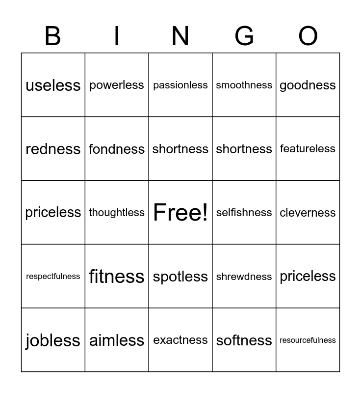 This bingo card has a free space and 24 words: fitness, aimless, shortness, jobless, goodness, useless, redness, powerless, selfishness, spotless, shortness, priceless, shrewdness, priceless, fondness, softness, cleverness, passionless, featureless, thoughtless, resourcefulness, respectfulness, smoothness and exactness.