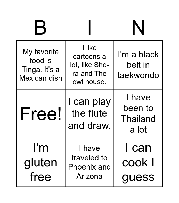 This bingo card has 10 words: I have traveled to Phoenix and Arizona, I'm a black belt in taekwondo, My favorite food is Tinga. It's a Mexican dish, I can play the flute and draw., Free!, I'm gluten free, I like cartoons a lot, like She-ra and The owl house., I like to watch anime, I have been to Thailand a lot and I can cook I guess.