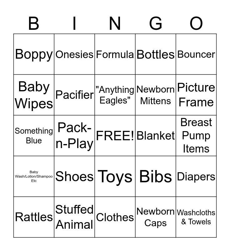 This bingo card has a free space and 24 words: Shoes, Stuffed Animal, "Anything Eagles", Rattles, Bouncer, Boppy, Baby Wipes, Onesies, Blanket, Toys, Newborn Mittens, Something Blue, Bibs, Diapers, Pacifier, Newborn Caps, Breast Pump Items, Formula, Picture Frame, Pack-n-Play, Washcloths & Towels, Baby Wash/Lotion/Shampoo Etc, Bottles and Clothes.