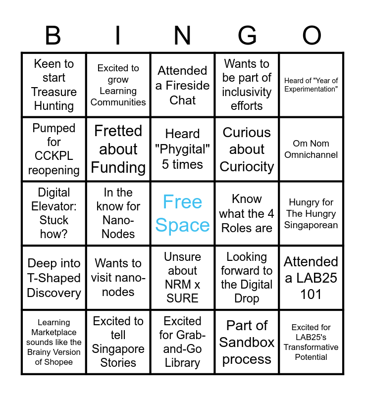 This bingo card has a free space and 24 words: Wants to visit nano-nodes, Excited to tell Singapore Stories, Heard "Phygital" 5 times, Learning Marketplace sounds like the Brainy Version of Shopee, Heard of "Year of Experimentation", Keen to start Treasure Hunting, Pumped for CCKPL reopening, Excited to grow Learning Communities, Know what the 4 Roles are, Unsure about NRM x SURE, Curious about Curiocity, Digital Elevator: Stuck how?, Looking forward to the Digital Drop, Attended a LAB25 101, Fretted about Funding, Part of Sandbox process, Hungry for The Hungry Singaporean, Attended a Fireside Chat, Om Nom Omnichannel, In the know for Nano-Nodes, Excited for LAB25's Transformative Potential, Deep into T-Shaped Discovery, Wants to be part of inclusivity efforts and Excited for Grab-and-Go Library.