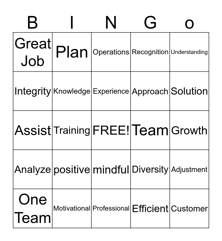 This bingo card has a free space and 45 words: Appreciation, Customer, Client, One Team, Thank you, Efficient, Operations, Procedure, Understanding, Motivational, Recognition, Team, mindful, positive, Problem, Professional, Communicate, Assist, Interactions, Solution, Plan, Together, Suggestions, Great Job, Improvement, Growth, Development, Inclusion, Diversity, Analyze, Research, Adjustment, Fulfillment, Representative, Leader, Training, Coach, Encourage, Success, Experience, Integrity, Approach, Power, Knowledge and Perception.