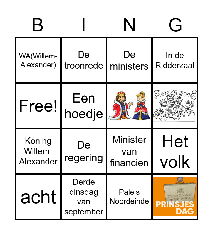This bingo card has 3 images and 13 words: Derde dinsdag van september, Het volk, De ministers, WA(Willem-Alexander), Koning Willem-Alexander, De troonrede, Minister van financien, Paleis Noordeinde, Free!, Een hoedje, acht, In de Ridderzaal and De regering.