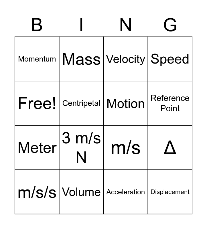 This bingo card has 16 words: Volume, Δ, Velocity, Momentum, Meter, Mass, m/s, Acceleration, Free!, Centripetal, m/s/s, Speed, 3 m/s N, Reference Point, Motion and Displacement.