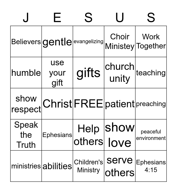 This bingo card has a free space and 24 words: Ephesians, abilities, gifts, ministries, Work Together, Believers, humble, gentle, patient, Help others, church unity, show respect, show love, peaceful environment, use your gift, serve others, preaching, evangelizing, teaching, Christ, Ephesians 4:15, Speak the Truth, Choir Ministey and Children's Ministry.