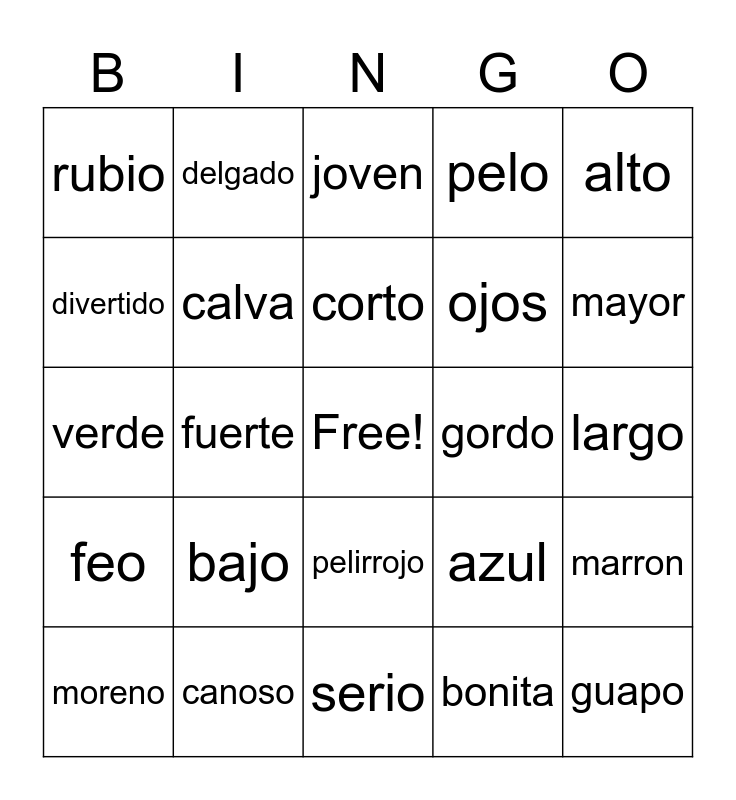 This bingo card has a free space and 24 words: bajo, canoso, corto, moreno, alto, rubio, divertido, delgado, gordo, pelirrojo, ojos, verde, azul, marron, calva, bonita, largo, joven, mayor, fuerte, guapo, feo, pelo and serio.