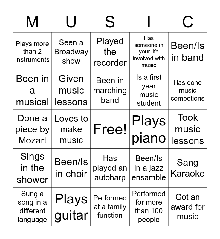 This bingo card has a free space and 24 words: Been/Is in choir, Plays guitar, Been in marching band, Sung a song in a different language, Been/Is in band, Plays more than 2 instruments, Been in a musical, Seen a Broadway show, Plays piano, Has played an autoharp, Is a first year music student, Done a piece by Mozart, Been/Is in a jazz ensamble, Sang Karaoke, Given music lessons, Performed for more than 100 people, Took music lessons, Played the recorder, Has done music competions, Loves to make music, Got an award for music, Sings in the shower, Has someone in your life involved with music and Performed at a family function.