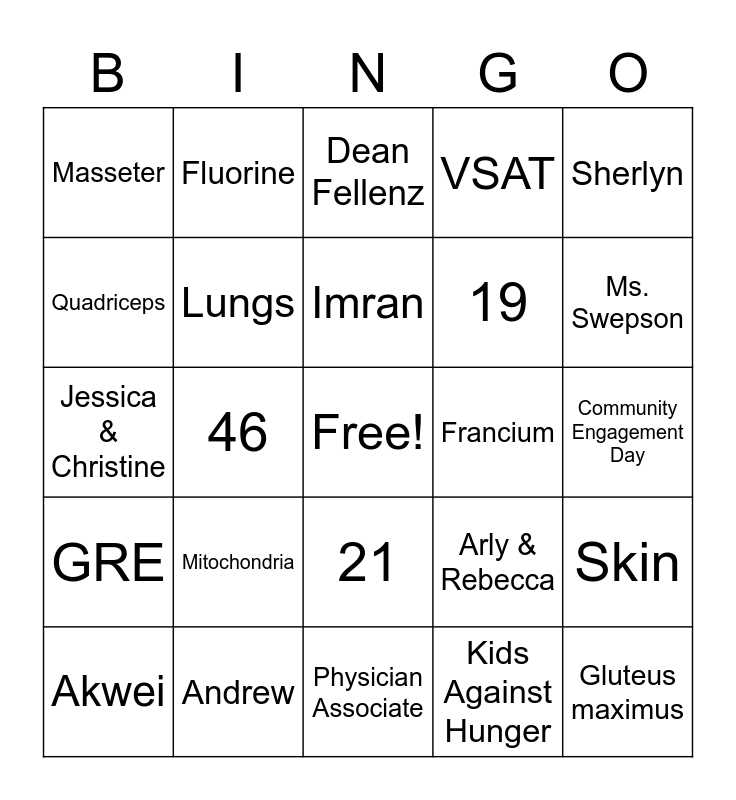 This bingo card has a free space and 24 words: Mitochondria, Andrew, Imran, Akwei, Sherlyn, Masseter, Quadriceps, Fluorine, Francium, 21, 19, Jessica & Christine, Arly & Rebecca, Skin, Lungs, Kids Against Hunger, Community Engagement Day, Dean Fellenz, Ms. Swepson, 46, Gluteus maximus, GRE, VSAT and Physician Associate.