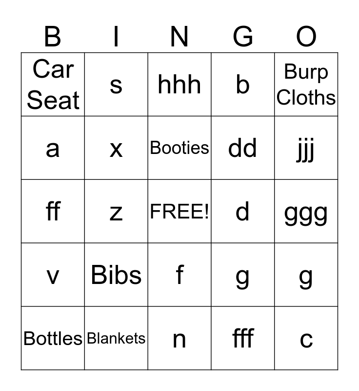 This bingo card has a free space and 24 words: Bibs, Blankets, Booties, Bottles, Burp Cloths, Car Seat, a, s, d, f, dd, ff, g, g, x, fff, ggg, hhh, jjj, z, c, v, b and n.