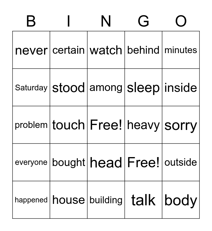 This bingo card has a free space and 27 words: Free!, Free!, sleep, building, Saturday, watch, certain, everyone, heavy, outside, problem, behind, happened, house, inside, neither, stood, among, bought, never, sorry, talk, touch, body, head, minutes and myself.