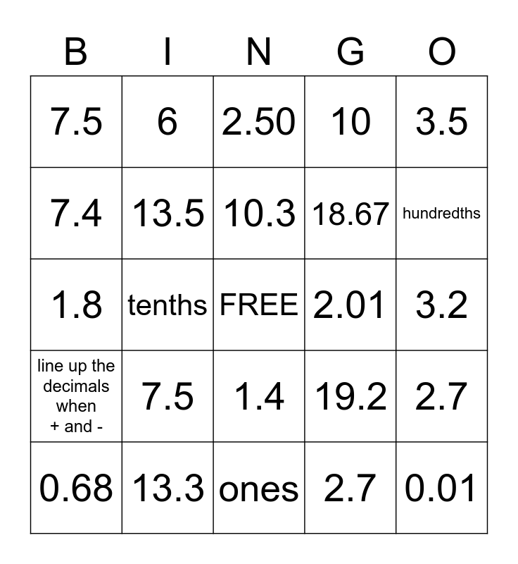 This bingo card has a free space and 24 words: 7.5, 13.3, 10.3, 0.68, 3.5, 7.5, 7.4, 6, 2.01, 1.4, 18.67, 1.8, 19.2, 2.7, 13.5, 2.7, 3.2, 2.50, hundredths, tenths, 0.01, line up the decimals when + and -, 10 and ones.