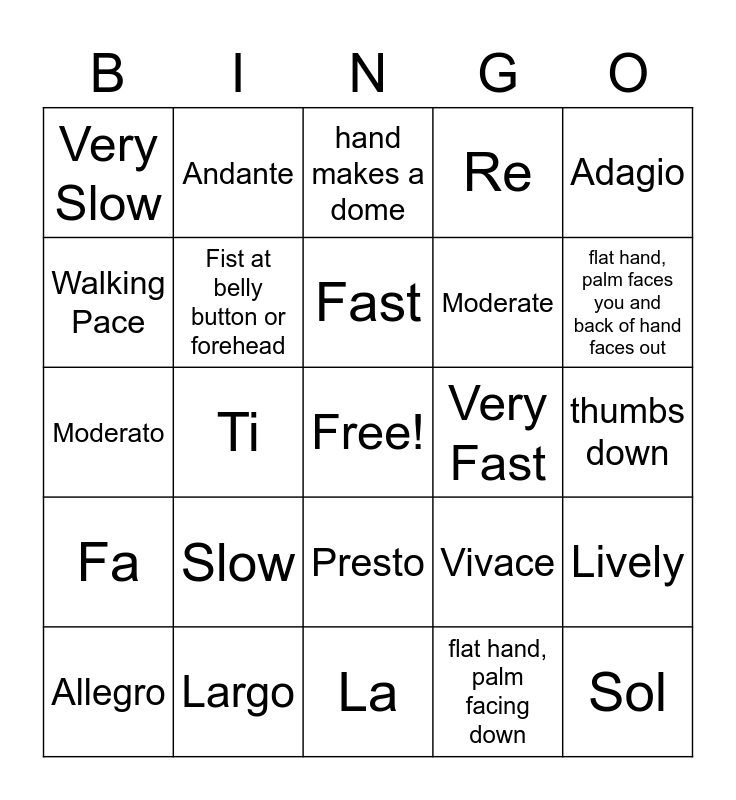 This bingo card has a free space and 24 words: Slow, Largo, Fast, Allegro, Adagio, Very Slow, Walking Pace, Andante, Very Fast, Presto, Moderate, Moderato, Vivace, Lively, Fist at belly button or forehead, flat hand, palm facing down, thumbs down, hand makes a dome, flat hand, palm faces you and back of hand faces out, Ti, Sol, Fa, Re and La.
