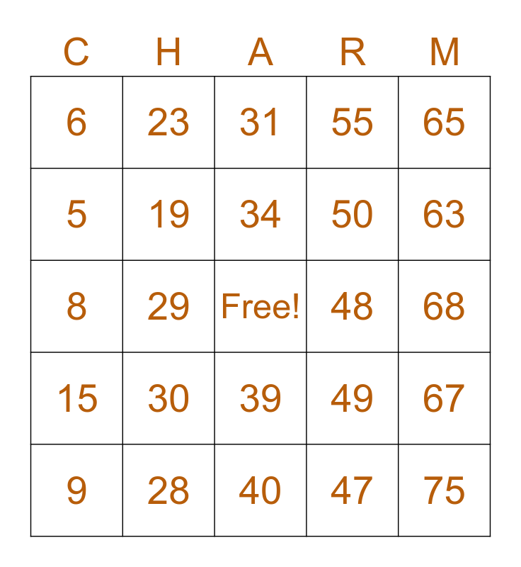 This bingo card has a free space and 75 words: 1, 16, 31, 46, 61, 2, 17, 32, 47, 62, 3, 18, 48, 63, 4, 19, 33, 49, 64, 5, 20, 34, 50, 65, 6, 21, 35, 51, 66, 7, 22, 36, 52, 67, 8, 23, 37, 53, 68, 9, 24, 38, 54, 69, 10, 25, 39, 55, 70, 11, 26, 40, 56, 71, 12, 27, 41, 57, 72, 13, 28, 42, 58, 73, 14, 29, 43, 59, 74, 15, 30, 44, 60, 75 and 45.