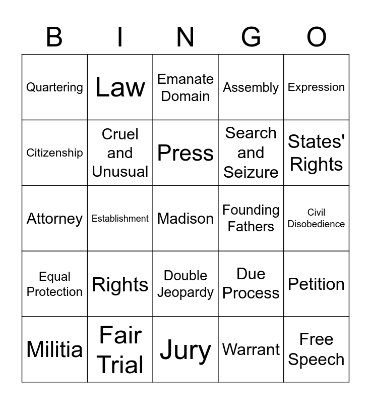 This bingo card has 30 words: Fair Trial, Bear Arms, Establishment, Freedom, Quartering, Emanate Domain, Cruel and Unusual, Double Jeopardy, Founding Fathers, Jury, Civil Disobedience, Madison, Warrant, Free Speech, States' Rights, 1791, Due Process, Equal Protection, Rights, Expression, Attorney, Congress, Law, Search and Seizure, Citizenship, Assembly, Petition, Militia, Press and Privacy.