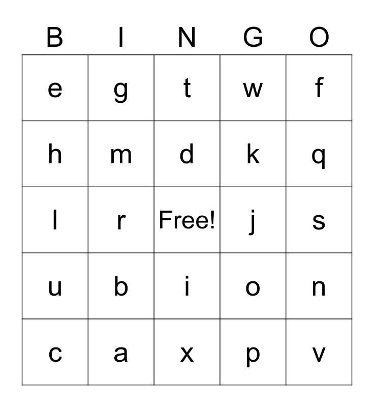 This bingo card has a free space and 24 words: b, a, d, c, f, e, h, g, j, i, k, l, o, n, m, p, s, t, q, r, v, u, w and x.