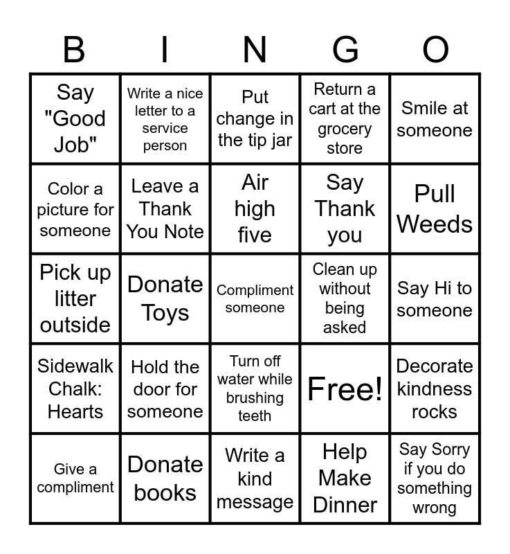This bingo card has 25 words: Hold the door for someone, Write a kind message, Air high five, Give a compliment, Smile at someone, Say "Good Job", Color a picture for someone, Write a nice letter to a service person, Clean up without being asked, Turn off water while brushing teeth, Say Thank you, Pick up litter outside, Free!, Decorate kindness rocks, Leave a Thank You Note, Say Sorry if you do something wrong, Say Hi to someone, Put change in the tip jar, Pull Weeds, Donate Toys, Compliment someone, Donate books, Sidewalk Chalk: Hearts, Return a cart at the grocery store and Help Make Dinner.