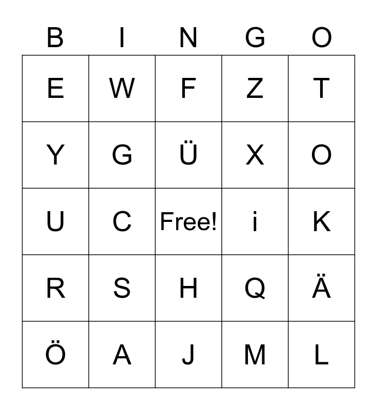 This bingo card has a free space and 30 words: A, B, C, D, E, F, G, H, i, J, K, L, M, N, O, P, Q, R, S, T, U, V, W, X, Y, Z, Ä, Ö, Ü and ß.