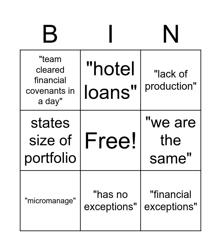 This bingo card has a free space and 8 words: "we are the same", "lack of production", "hotel loans", "micromanage", "team cleared financial covenants in a day", "financial exceptions", states size of portfolio and "has no exceptions".
