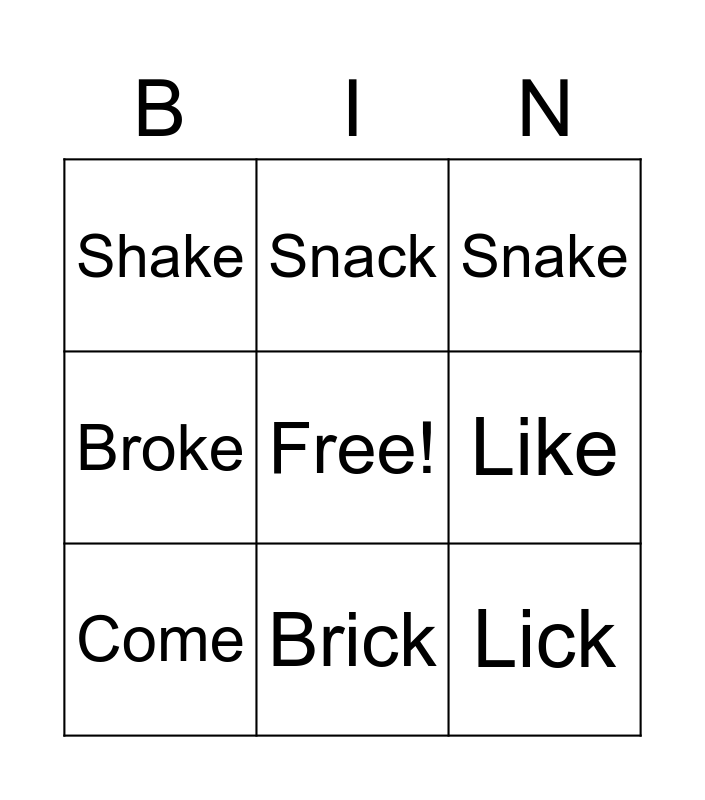 This bingo card has a free space and 12 words: Back, Bake, Lick, Like, Snack, Snake, Brick, Clock, Shake, Broke, Come and To.