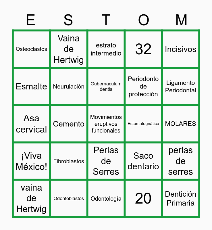 This bingo card has 1 images, a free space and 44 words: Flúor, Fibroblastos, Pulpa, 20, CANINOS, Maxilar, Neurulación, Procesos maxilares, 32, Dentición Primaria, Osteoclastos, Odontoblastos, Saco dentario, MOLARES, Estadio de Brote o Yema, Furca, Odontología, Estomatognático, Retículo estrellado, Asa cervical, Vaina de Hertwig, Perlas de Serres, Pre molares, Incisivos, erupción, odontogénesis, Gubernaculum dentis, dientes permanentes, perlas de serres, vaina de Hertwig, nodo del esmalte, estrato intermedio, Dentina, Corona clínica, ¡Viva México!, Hueso Alveolar, Germen del diente permanente, Fibroblastos, Ligamento Periodontal, Esmalte, Cemento, Periodonto de Inserción, Periodonto de protección and Rizoclasia.