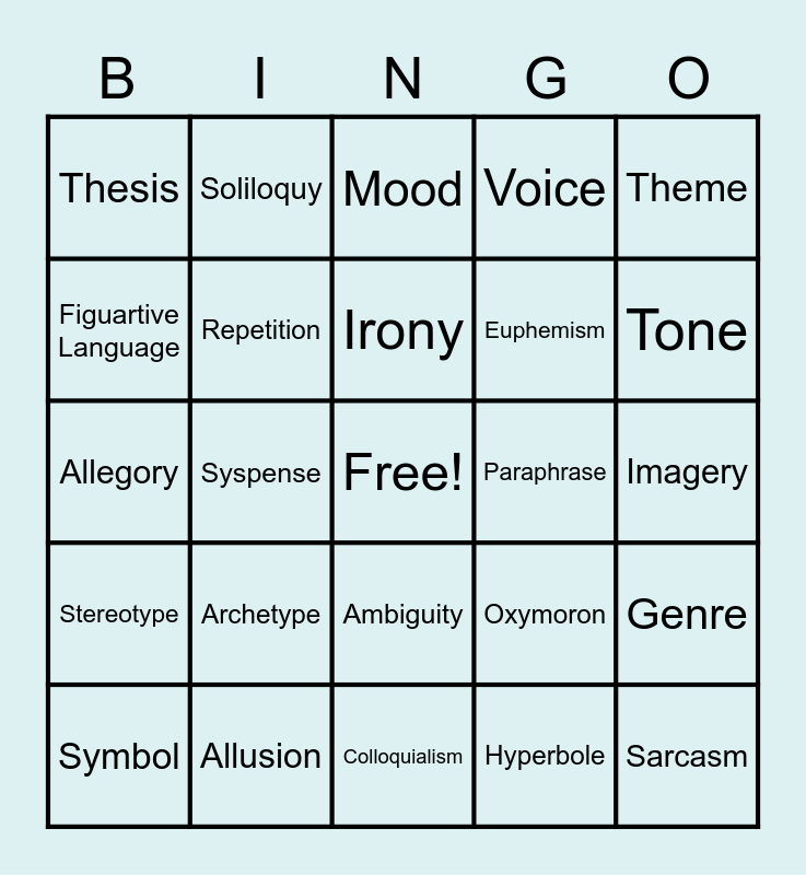 This bingo card has a free space and 24 words: Archetype, Allusion, Irony, Symbol, Theme, Thesis, Figuartive Language, Soliloquy, Paraphrase, Ambiguity, Euphemism, Allegory, Oxymoron, Genre, Repetition, Hyperbole, Imagery, Mood, Tone, Syspense, Sarcasm, Stereotype, Voice and Colloquialism.