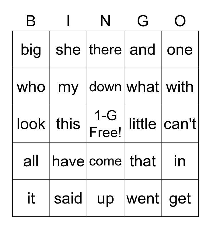 This bingo card has a free space and 24 words: have, said, down, it, one, big, who, she, little, come, what, look, that, in, my, went, can't, there, with, this, get, all, and and up.
