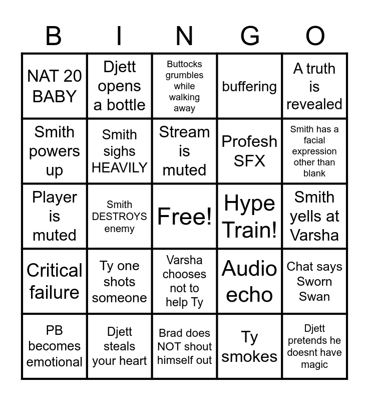 This bingo card has a free space and 24 words: Ty one shots someone, Djett steals your heart, Stream is muted, PB becomes emotional, A truth is revealed, NAT 20 BABY, Smith powers up, Djett opens a bottle, Hype Train!, Varsha chooses not to help Ty, Profesh SFX, Player is muted, Audio echo, Chat says Sworn Swan, Smith sighs HEAVILY, Ty smokes, Smith yells at Varsha, Buttocks grumbles while walking away, Smith has a facial expression other than blank, Smith DESTROYS enemy, Djett pretends he doesnt have magic, Critical failure, buffering and Brad does NOT shout himself out.