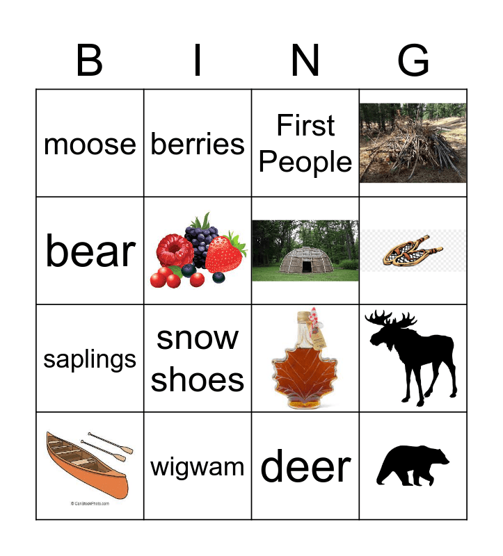 This bingo card has 9 images and 11 words: maple syrup, First People, bear, wigwam, moose, saplings, berries, snow shoes, canoe, deer and fish.