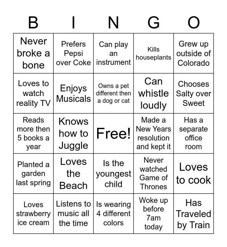 This bingo card has a free space and 24 words: Loves the Beach, Listens to music all the time, Owns a pet different then a dog or cat, Loves strawberry ice cream, Grew up outside of Colorado, Never broke a bone, Loves to watch reality TV, Prefers Pepsi over Coke, Made a New Years resolution and kept it, Is the youngest child, Can whistle loudly, Reads more then 5 books a year, Never watched Game of Thrones, Loves to cook, Enjoys Musicals, Woke up before 7am today, Has a separate office room, Can play an instrument, Chooses Salty over Sweet, Knows how to Juggle, Has Traveled by Train, Planted a garden last spring, Kills houseplants and Is wearing 4 different colors.