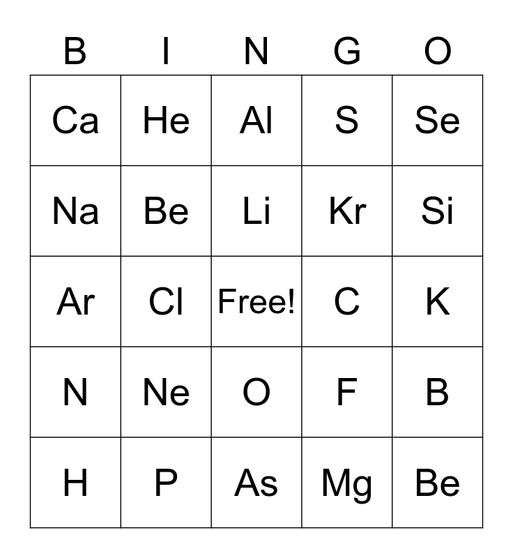 This bingo card has a free space and 24 words: Ne, P, Li, H, Se, Ca, Na, He, C, O, Kr, Ar, F, B, Be, Mg, K, Al, Si, Cl, Be, N, S and As.