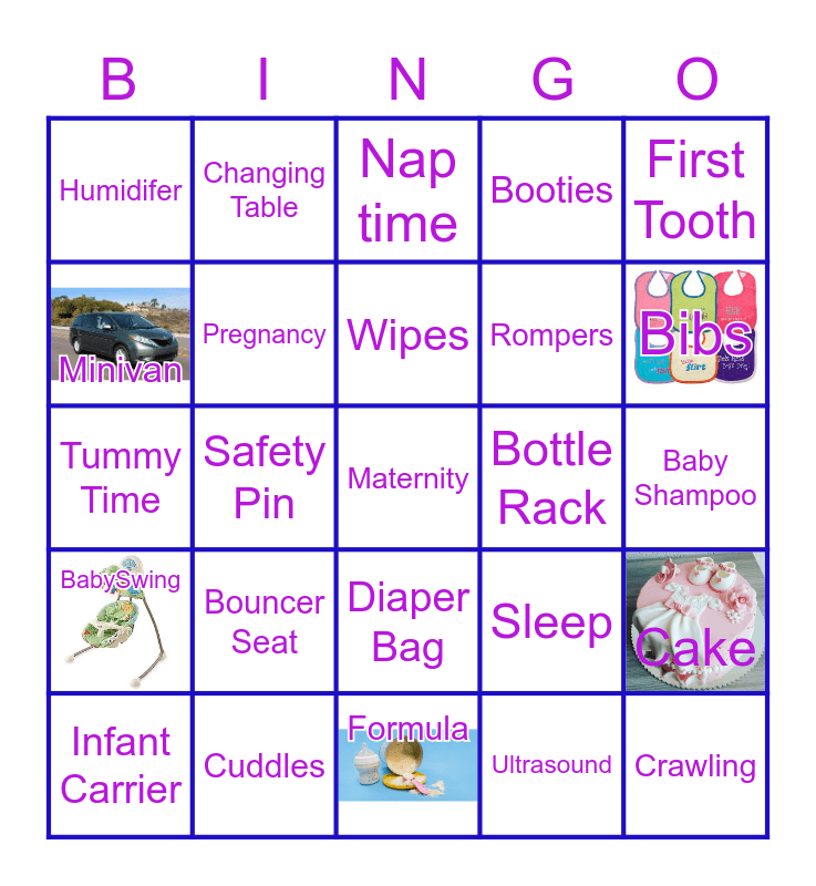 This bingo card has 27 images and 101 words: Swaddle, TeddyBear, First Tooth, Bottles, RubberDuck, Baby Carrier, Baby Clothes, BabyFood, Teething Ring, BathTime, BabyShoes, Baby Shower, BoppyPillow, First Steps, Tiny Fingers, Babysitter, BabySwing, First Word, Baby Walker, Baby's Name, Stroller, Book, Bassinet, Alphabet Blocks, Lullaby, Bibs, Booties, Bouncer Seat, Cravings, CarSeat, Changing Table, Nap time, Cradle, Crib, Diapers, Diaper Bag, Blanket, Rocking Chair, Ultrasound, Formula, High Chair, Infant Carrier, WubbaNub, Rattle, Stacking Rings, Maternity, Maternity Clothes, Sippy Cup, Mommy, Crawling, Baby Fat, Minivan, Nursery, Nursery Rhyme, Onesies, Pacifier, Parent, Diaper Rash, Pack and Play, Cooing, Pregnancy, Childproofing, Bottle warmer, Mobile, Receiving Blanket, Rompers, Safety Gate, Safety Pin, Cuddles, Toddler, Toys, Rolling Over, Humidifer, Kisses, Wipes, Tummy Time, Daddy, Quilt, Smiles, Burp Cloth, Sterilizer, Due Date, Bottle Rack, Layette, Baby Proofing, Nursing Pillow, Baby Shampoo, Mamaroo, Infant Tub, Potty Training, Sleep, Sophie, Snoo, White Noise Machine, NightLight, Cake, Baby Yoga, Memories, Grandparents, Baby Monitor and Family.