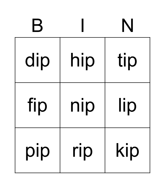 This bingo card has a free space and 8 words: lip, tip, hip, pip, dip, kip, fip and rip.