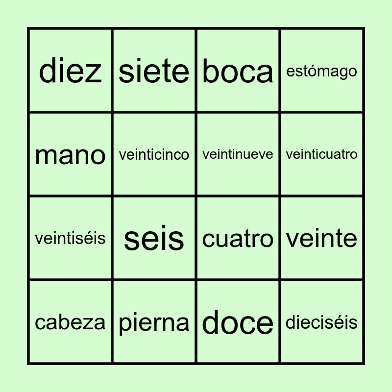 This bingo card has 43 words: Free!, cabeza, pelo, ojos, orejas, nariz, boca, brazo, mano, dedo, estómago, pierna, pie, cero, uno, dos, tres, cuatro, cinco, seis, siete, ocho, nueve, diez, once, doce, trece, catorce, quince, dieciséis, diecisiete, dieciocho, diecinueve, veinte, veintiuno, veintitrés, veintidós, veinticuatro, veinticinco, veintiséis, veintiocho, veintinueve and treinta.